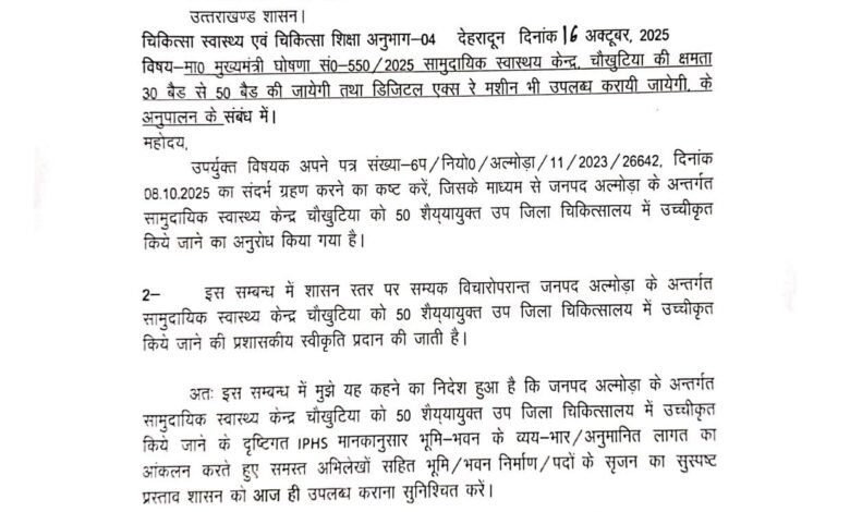 विषय- मुख्यमंत्री घोषणा सं0-550/2025 सामुदायिक स्वास्थय केन्द्र, चौखुटिया की क्षमता 30 बैड से 50 बैड की जायेगी तथा डिजिटल एक्स रे मशीन भी उपलब्ध करायी जायेगी. के अनुपालन के संबंध में।