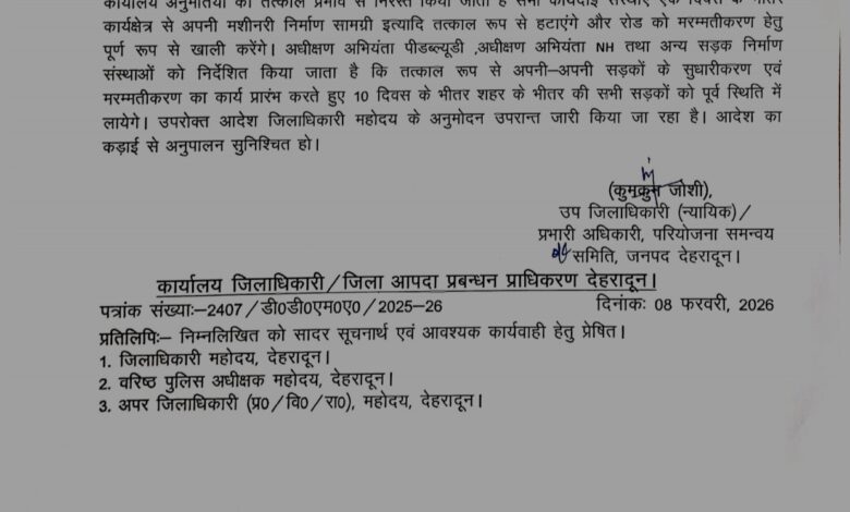 जिला प्रशासन द्वारा कार्यदाई संस्थाओं को एक दिवस के भीतर कार्यक्षेत्र से तत्काल अपनी मशीनरी निर्माण सामग्री इत्यादि हटाते हुए रोड को 10 दिन भीतर पूर्व स्थिति में लाने के निर्देश दिए है।