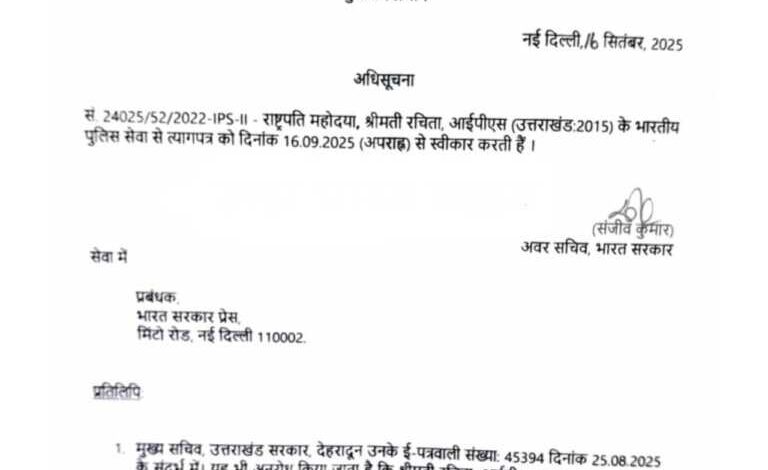 गौरतलब है कि उत्तराखंड सरकार के मुख्य सचिव ने भी 25 अगस्त 2025 को रचिता के इस्तीफे से संबंधित प्रस्ताव केंद्र को भेजा था। इसके बाद गृह मंत्रालय ने अधिसूचना जारी कर दी।