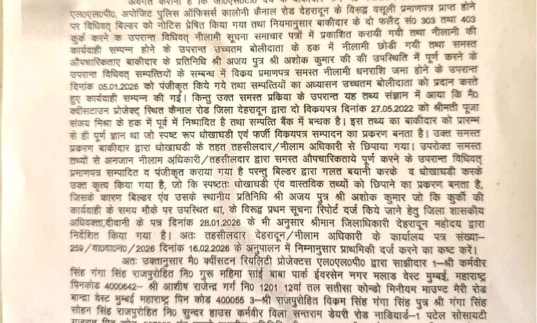 बिल्डर की जालसाजी सामने आने के बाद जिला प्रशासन की तहरीर पर राजपुर थाना पुलिस ने बिल्डर व उसके प्रतिनिधि के विरुद्ध मुकदमा दर्ज कर लिया है। मैसर्स क्वींसटन रियलिटी प्रोजेक्टस एलएलपी, कैनाल रोड पर जीएसटी देय बकाया चल रहा है। जीएसटी जमा न करने पर तहसीलदार सदर ने 05 जनवरी को बिल्डर के दो फ्लैट कुर्क कर दिए थे।