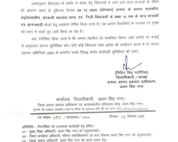 उक्तानुसार शीतलहर के प्रकोप से बचाव हेतु विद्यालयों में जाने वाले छात्र-छात्राओं के जीवन को आसन्न खतरे के दृष्टिगत 29-12-2025 (सोमवार) जनपद के समस्त शासकीय, अर्द्धशासकीय, सरकारी सहायता प्राप्त, एवं निजी विद्यालयों के कक्षा 12 तक के छात्र छात्राओं एंव आंगनबाडी केन्द्रों हेतु अवकाश घोषित किया जाता है। यह आदेश विद्यार्थियों के स्वास्थ्य एवं सुरक्षा को ध्यान में रखते हुए जारी किया जा रहा है।