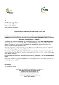 उत्तराखंड को “FICCI द्वारा आयोजित ‘इंडिया स्पोर्ट्स अवार्ड 2025’ में सर्वश्रेष्ठ उभरता राज्य का खिताब